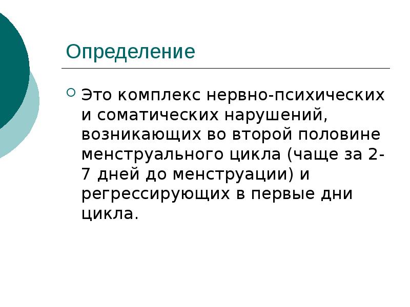 Это комплекс нервно-психических и соматических нарушений, возникающих во второй половине менструального цикла (чаще за 2-7 дней до менструации) и регрессирующих в первые дни цикла.