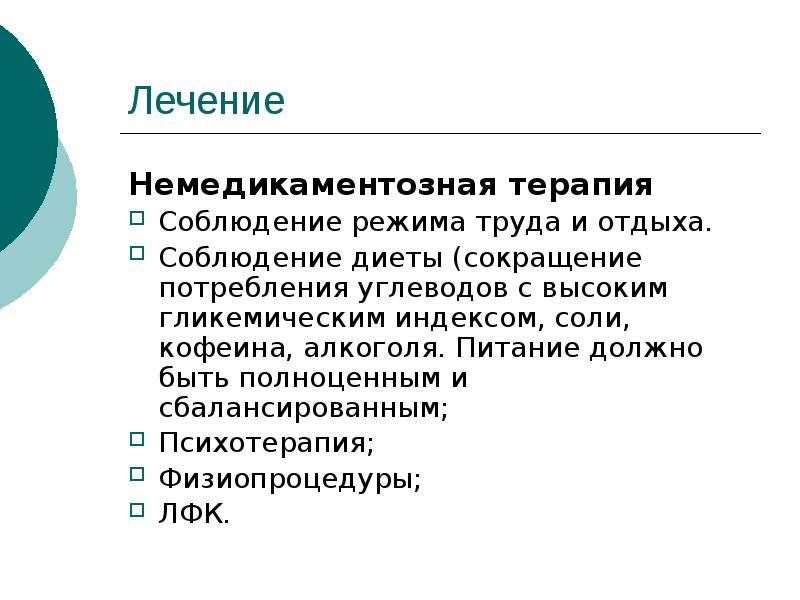 Соблюдение диеты (сокращение потребления углеводов с высоким гликемическим индексом, соли, кофеина, алкоголя. Питание должно быть полноценным и сбалансированным;