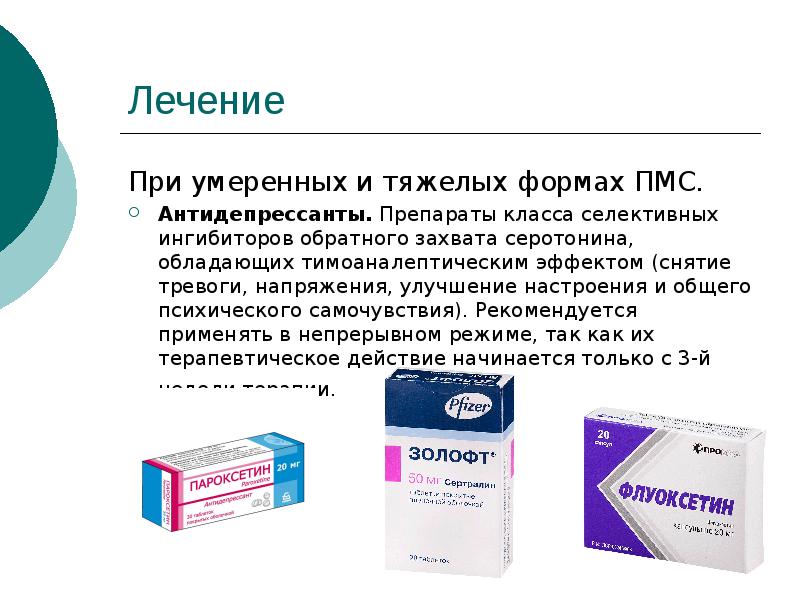 Антидепрессанты. Препараты класса селективных ингибиторов обратного захвата серотонина, обладающих тимоаналептическим эффектом (снятие тревоги, напряжения, улучшение настроения и общего психического самочувствия). Рекомендуется применять в непрерывном режиме, так как их терапевтическое действие начинается только с 3-й недели терапии.