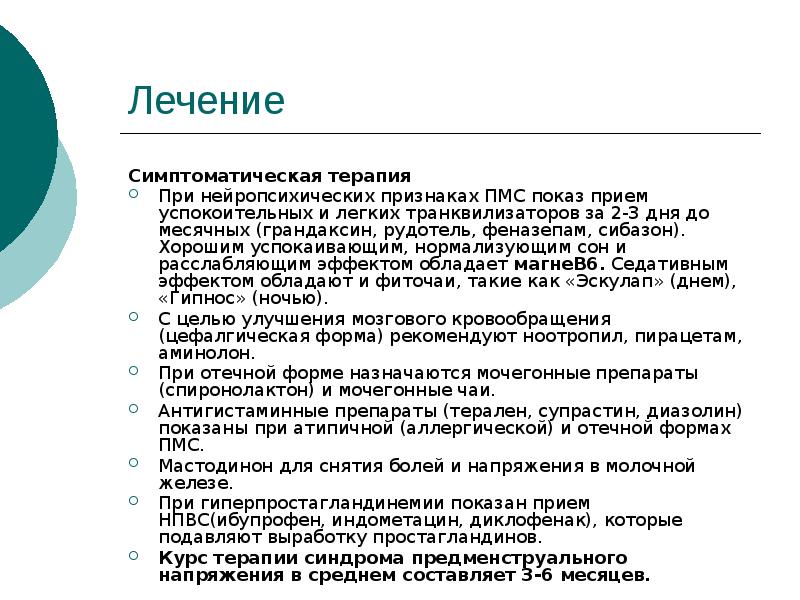 При нейропсихических признаках ПМС показ прием успокоительных и легких транквилизаторов за 2-3 дня до месячных (грандаксин, рудотель, феназепам, сибазон). Хорошим успокаивающим, нормализующим сон и расслабляющим эффектом обладает магнеВ6. Седативным эффектом обладают и фиточаи, такие как «Эскулап» (днем), «Гипнос» (ночью).