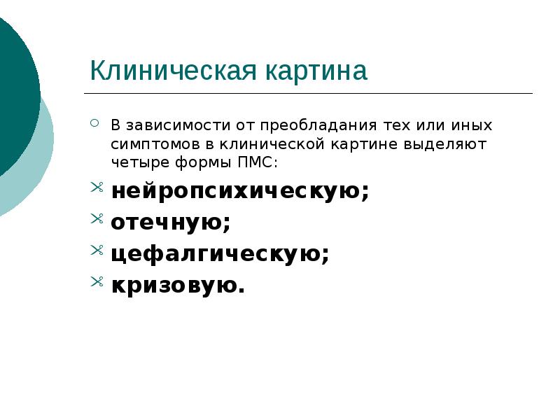 Клиническая картина предменструального синдрома характеризуется своим симптоматическим многообразием. Она включает в себя: психоэмоциональные симптомы (например, раздражительность, депрессия, плаксивость); симптомы вегето-сосудистых нарушений (головная боль, тошнота, рвота, боли в сердце); симптомы, отражающие обменно-эндокринные нарушения (нагрубание молочных желез, отеки, зуд, повышение температуры тела и др. ). В зависимости от преобладания тех или иных симптомов выделяют четыре основных клинической формы болезни: нервно-психическая, отечная, цефалгическая и кризовая. Помимо этого, в зависимости от количества, длительности и интенсивности симптомов во время ПМС различают легкую и тяжелую формы течения заболевания. К легкой форме ПМС относят состояние, при котором наблюдается 3— 4 симптома за 2— 10 дней до менструации, а к тяжелой форме относят состояние, которому характерно проявление 5— 12 симптомов за 3— 14 дней до начала менструации. Также выделяют три стадии синдрома: компенсированную, субкомпенсированную и декомпенсированную.
