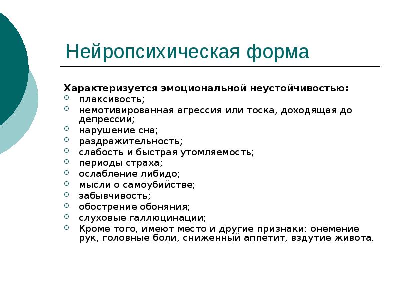 Эта форма отличается преобладанием вегето-сосудистой и неврологической симптоматики. Характерны: