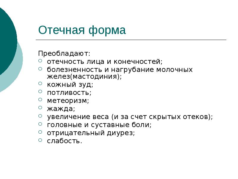 При отечной форме – измерение диуреза в течение 3-4 дней в обе фазы цикла, исследование функции почек (показатели очтаточного азота, креатинина и тд.), консультация терапевта;