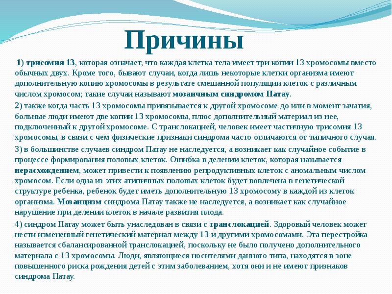1) трисомия 13, которая означает, что каждая клетка тела имеет три копии 13 хромосомы вместо обычных двух. Кроме того, бывают случаи, когда лишь некоторые клетки организма имеют дополнительную копию хромосомы в результате смешанной популяции клеток с различным числом хромосом; такие случаи называют мозаичным синдромом Патау.